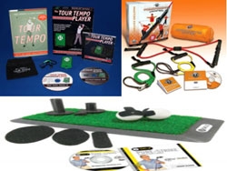 This package includes 3 different products; 1 pc Tour Tempo package with player (green) and book + 1 pc Pure Golf Strike mat and practice kit + 1 pc Golf Gym complete with 3 different cords